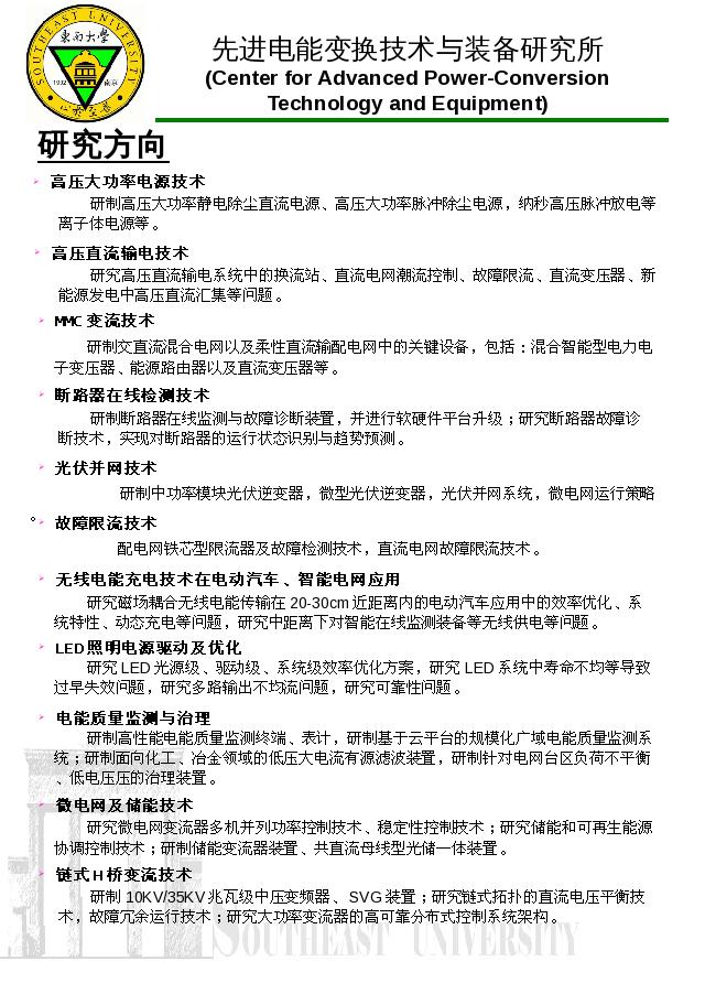 先进电能变换技术与装备研究所依托于ty8天游平台登录工程学院,主要从事电力电子与电能变换领域的重大基础理论与前沿关键技术研究,包括电能质量治理、直流电网装备、交直流输配电装备、新能源并网发电、分布式储能、高压大功率工业电源、无线电能传输和LED照明驱动等,多项研究成果已成功得到工业应用。