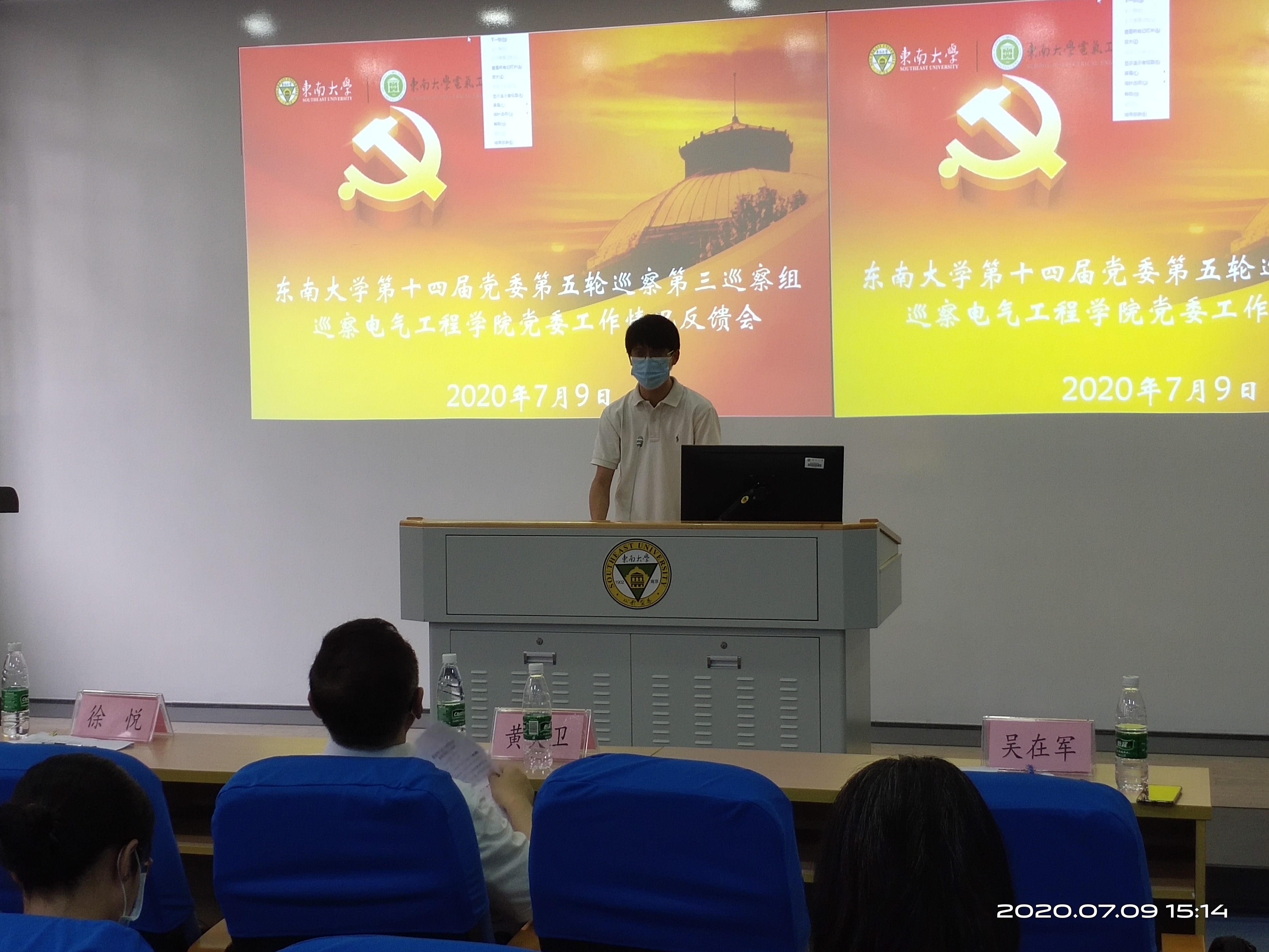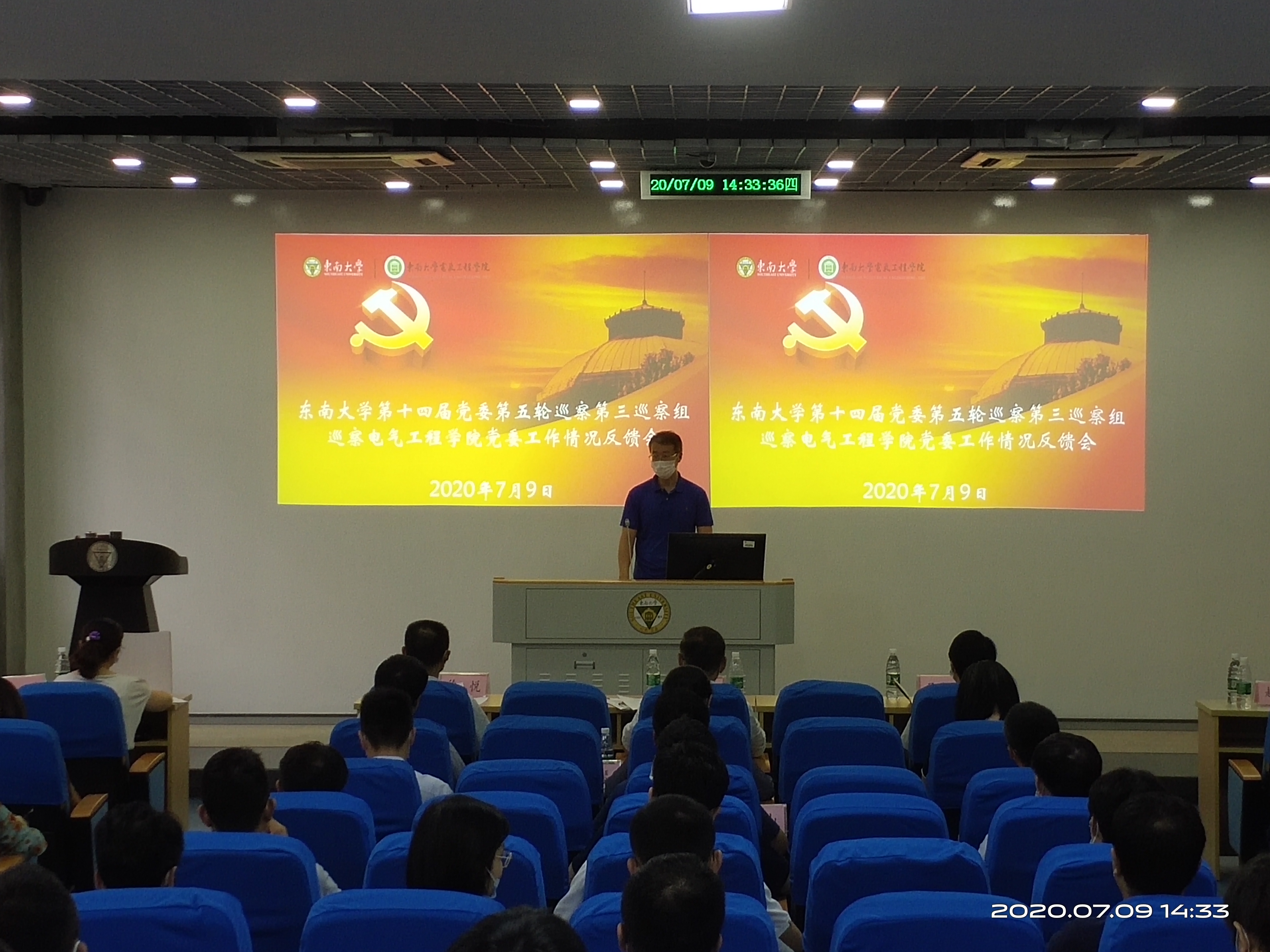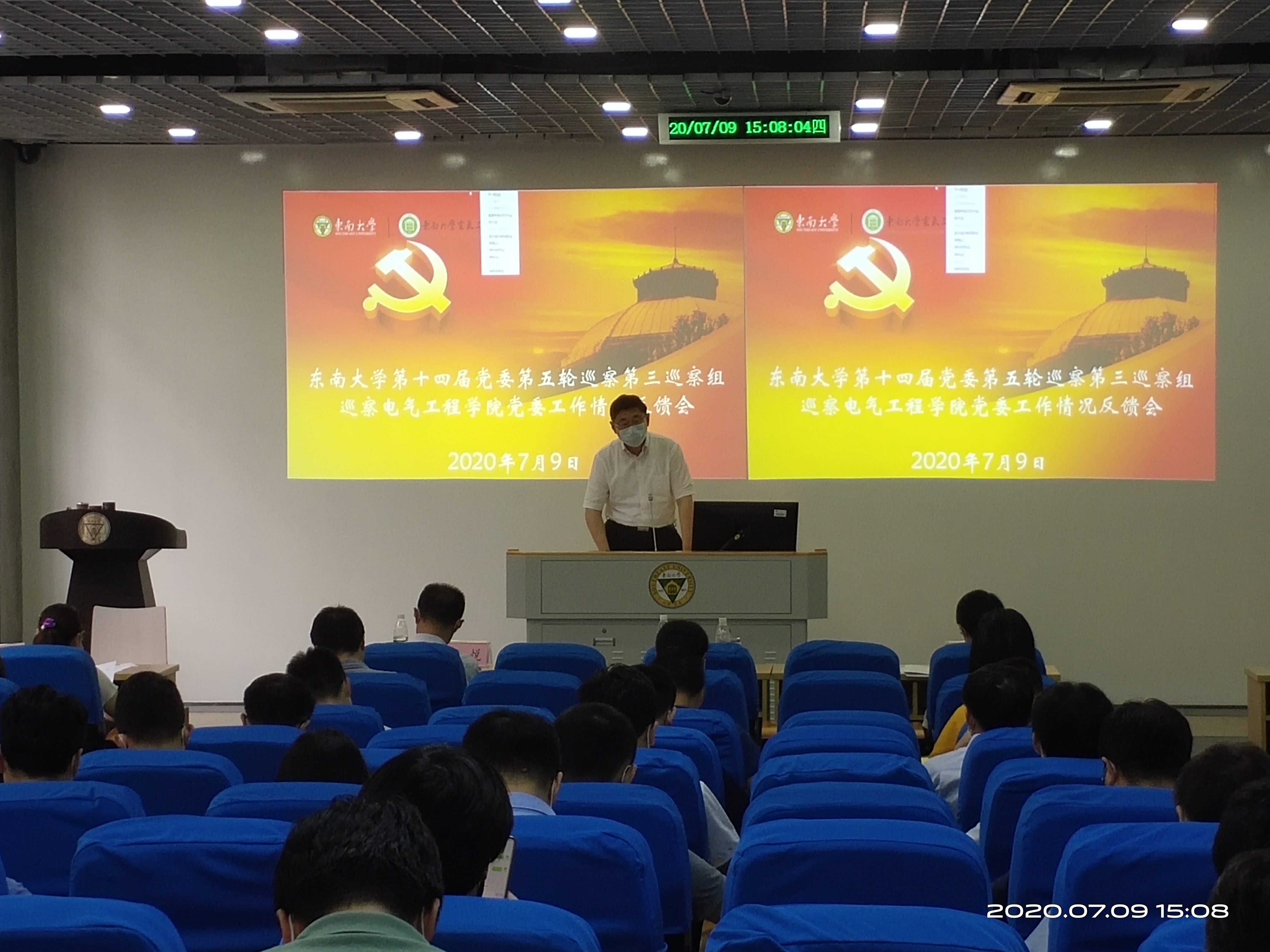 根据校党委巡察工作统一部署,东南大学第十四届党委第五轮巡察第三巡察组巡察电气工程学院党委工作情况反馈会于2020年7月9日下午在四牌楼校区东南院102举行。东南大学副校长黄大卫同志、组织部副处级组织员陆玲同志老师、巡察办副主任、纪委监察处副处长李瑛老师同志,第三巡察组全体成员、电气工程学院党政领导班子成员,党委委员、支部书记、研究所负责人、教代会主任、民主党派代表、学院科级以上干部、教师代表、退休教工代表、学生代表等参加了反馈会。会议由电气工程学院院长赵剑锋主持。