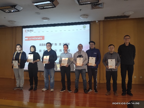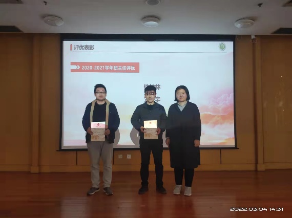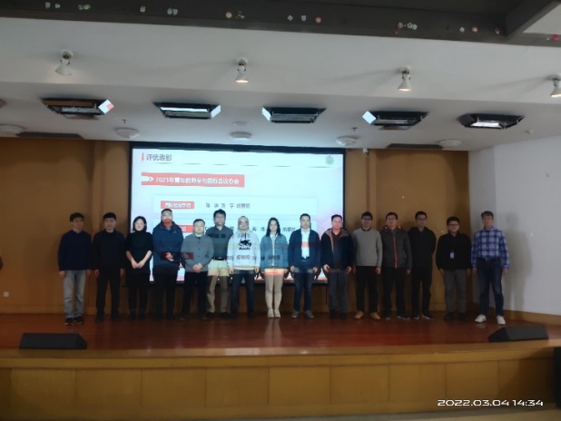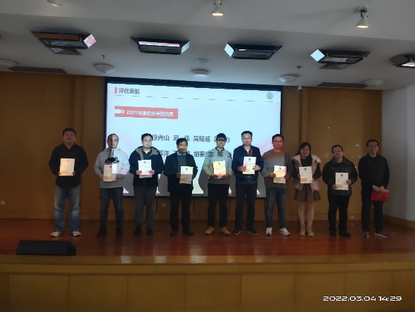 接着,举行2021年评优表彰,学院领导班子给年度考核优秀、积分考核优秀、班主任考核优秀的教师颁发荣证书,同时表彰了积极参与国际会议办会的青年教师并合影留念,党委书记吴在军代表学院领导班子,向取得优异成绩受到表彰的教职工表示祝贺,向为学院发展付出辛勤劳动的教职工表示感谢。