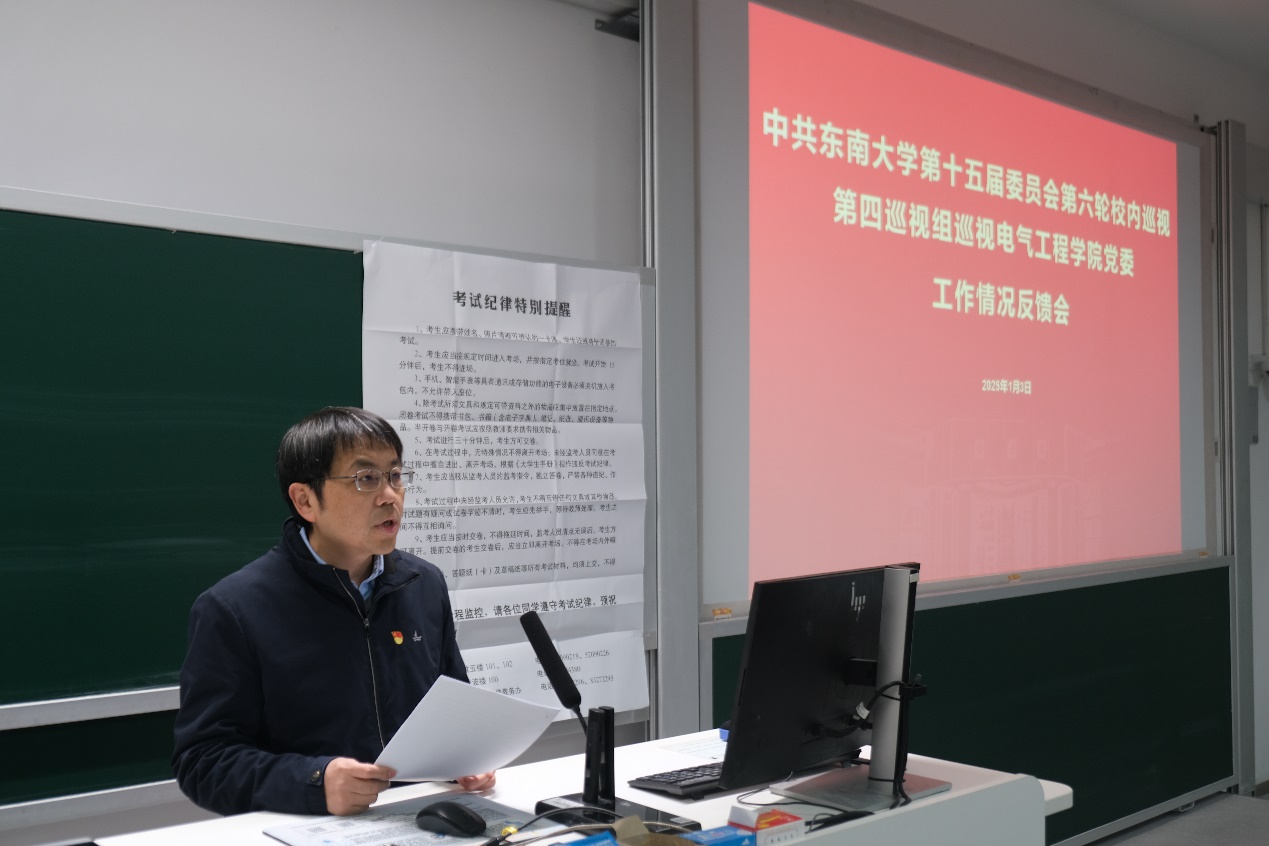 巡视组组长张在琛宣读了《东南大学十五届党委第六轮第四巡视组关于巡视电气工程学院党委的反馈意见》,巡视组在肯定学院各项成绩的同时,也客观负责地指出了巡视发现的问题和不足,并有针对性地提出了整改意见和建议。