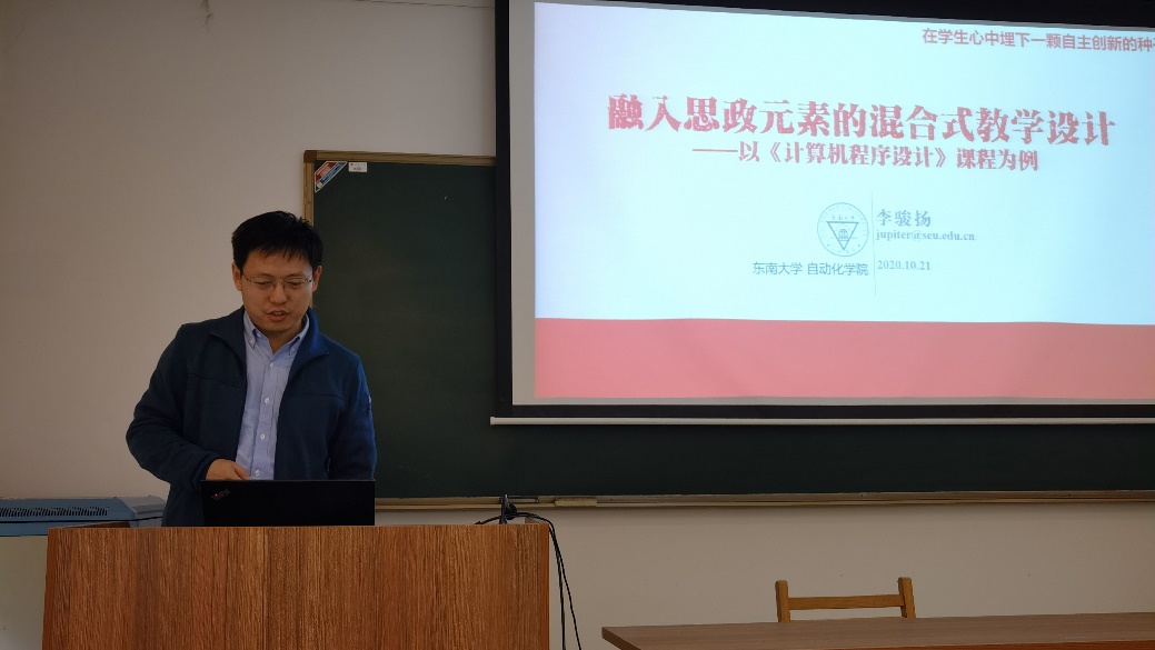 自动化学院的李骏扬老师以《计算机程序设计》这门课程为例,通过详实的细节讨论和分享了在工科课程的设计中如何通过“言传身教”、“融入情感”、“让思政隐形存在”、“让思政随时体现”以及“调动学生的主动性”等关键点,将课程思政与学习目标、学习内容、学习过程、教学评价等环节相结合。