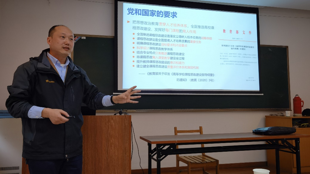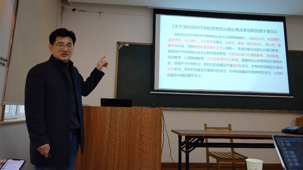 马克思主义学院的盛凌振副院长从“思政课程”与“课程思政”之间的关系、思政课程的设置与发展等角度对我校的思政课程体系进行了介绍,并分层次地总结了思政课程的理论脉络,即“理论方法是什么”、“理论方法从何而来”、“国家的政策与战略”、“成为什么样的人”。