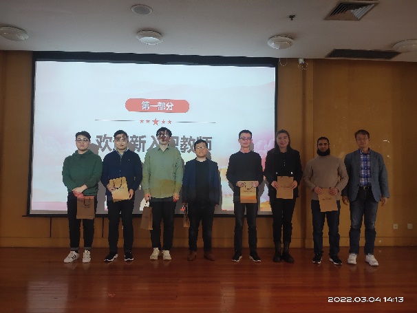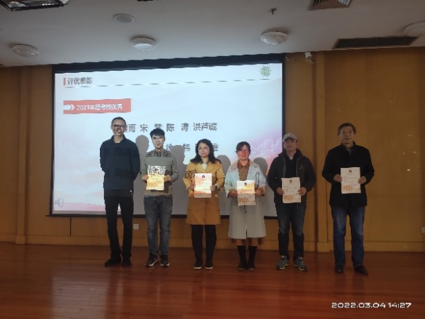 接着,举行2021年评优表彰,学院领导班子给年度考核优秀、积分考核优秀、班主任考核优秀的教师颁发荣证书,同时表彰了积极参与国际会议办会的青年教师并合影留念,党委书记吴在军代表学院领导班子,向取得优异成绩受到表彰的教职工表示祝贺,向为学院发展付出辛勤劳动的教职工表示感谢。