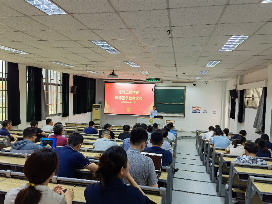 为深入学习贯彻习近平总书记关于教育的重要论述和指示批示精神,坚决落实师德师风第一标准,加强新形势下师德师风建设,电气工程学院于6月21日上午召开师德警示教育大会,学院党政领导班子成员、全体教职工参加会议。会议特别邀请校纪委副书记兼纪检监察机构办公室主任吴娟同志做题为“以案为鉴强警示 立德树人铸师魂”的警示教育。会议由学院党委书记吴在军主持。