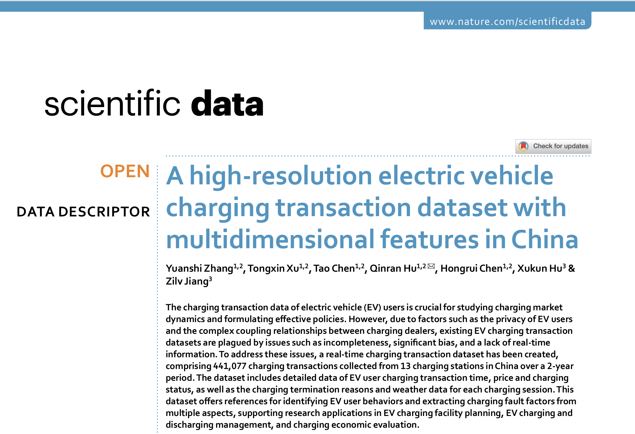 4月16日,ty8天游平台登录工程学院师生在Nature旗下专注于开放数据共享的权威期刊《Scientific Data》上发表题为“A high-resolution electric vehicle charging transaction dataset with multidimensional features in China”的研究论文。